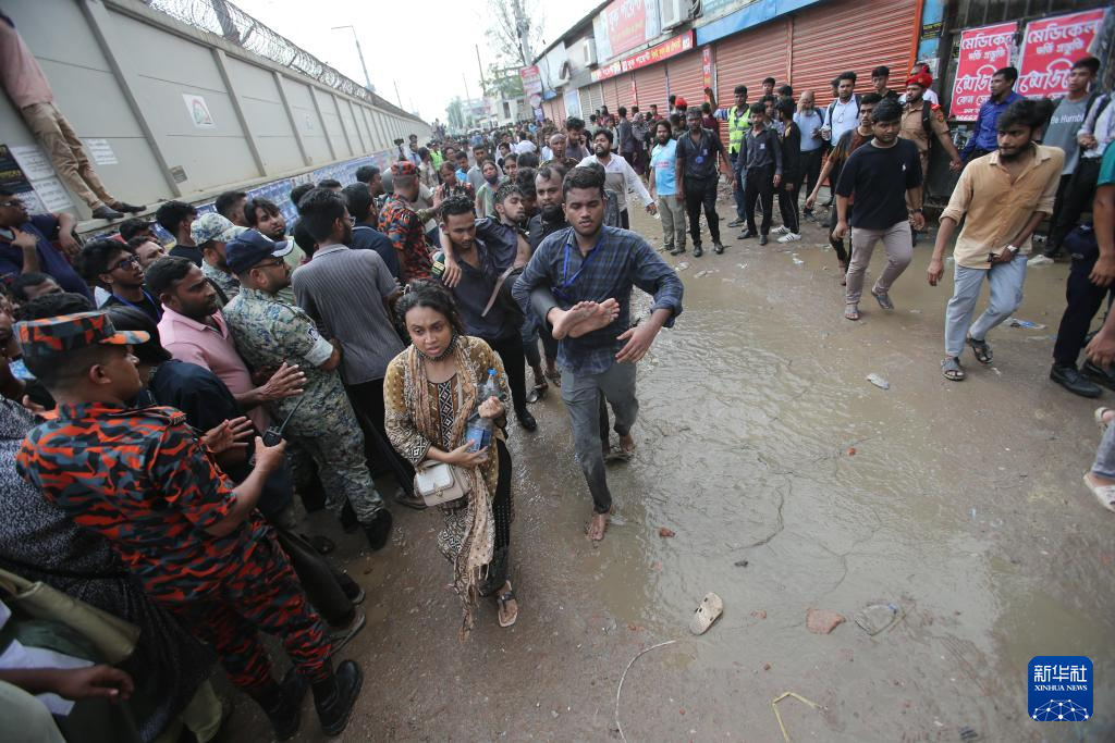 7月21日,在孟加拉国首都达卡,人们将伤者从教练机坠毁现场送去接受救治。新华社发(哈比卜·拉赫曼摄)