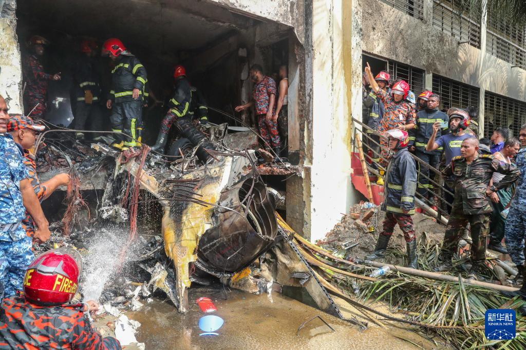 7月21日,在孟加拉国首都达卡,消防人员在教练机坠毁现场工作。新华社发