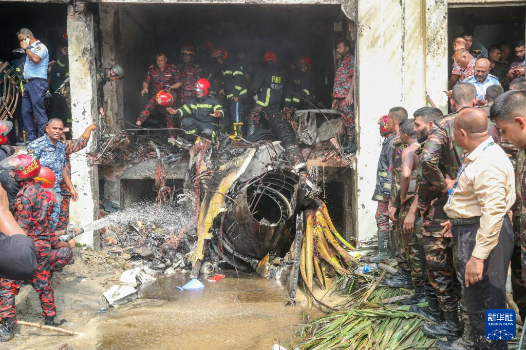 7月21日,在孟加拉国首都达卡,消防人员在教练机坠毁现场工作。新华社发(哈比卜·拉赫曼摄)