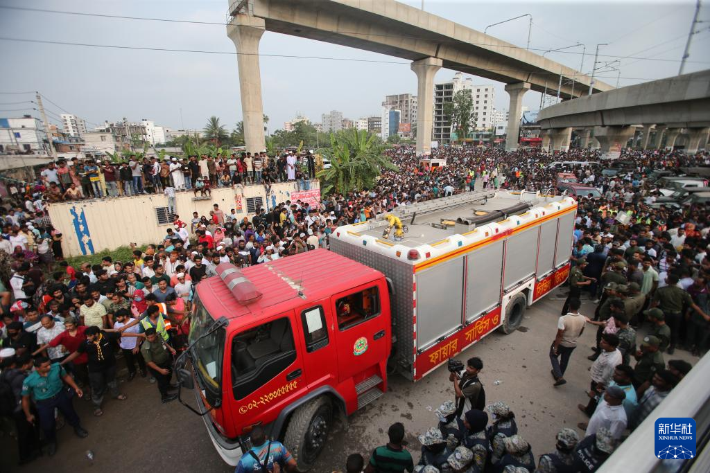 7月21日,在孟加拉国首都达卡,消防人员抵达教练机坠毁现场附近。新华社发(哈比卜·拉赫曼摄)