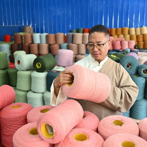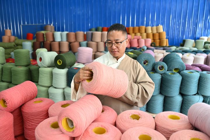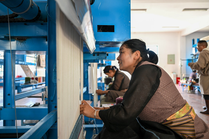 旦增称来正在检查染色后的纱线。新华社记者 李鑫 摄