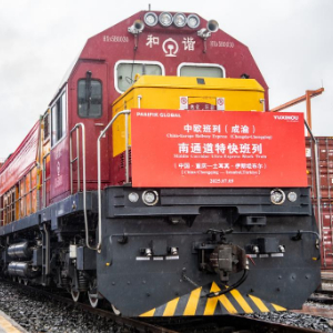 7月9日,中欧班列(成渝)南通道特快班列在重庆团结村中心站等候发车。新华社记者唐奕摄