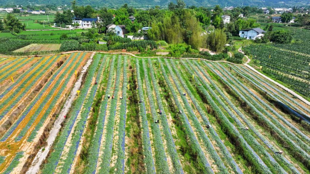 农户们正在采收南瓜(无人机照片)。(龚长浩摄)