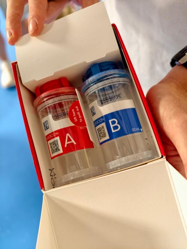平尼克-格雷向记者展示用于装尿样的A瓶和B瓶