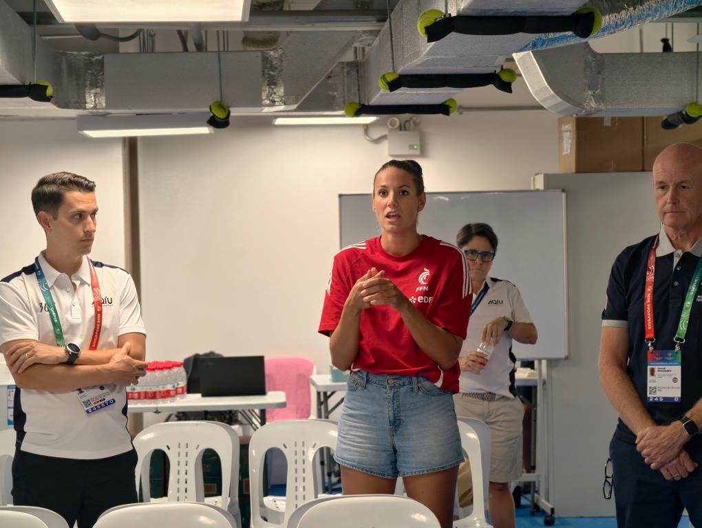 法国公开水域泳将卡罗琳·茹伊斯作为运动员代表演示部分接受兴奋剂检查的过程