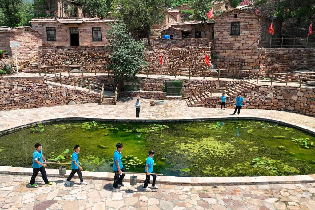 7月27日,河北省柏乡县职业技术教育中心学生在抗大旧址村邢台市信都区寨上村体验抬水(无人机照片)。新华社(陈雷摄)