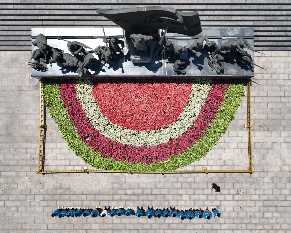 7月27日,河北省柏乡县职业技术教育中心学生在中国人民抗日军政大学陈列馆前学习(无人机照片)。新华社发(陈雷摄)