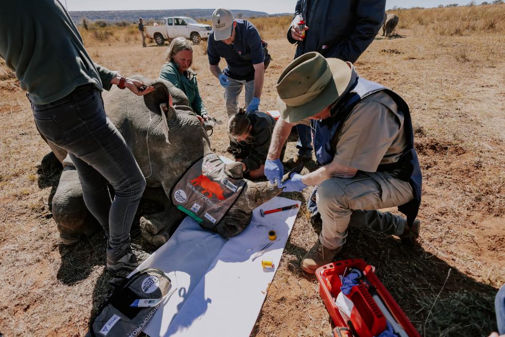 7月30日,在南非林波波省沃特伯格生物圈保护区,“犀牛同位素项目”首席科学官、金山大学教授詹姆斯·拉金(右一)在兽医团队的陪同下向一头白犀牛的角中注入放射性同位素。 新华社发(南非金山大学供图)
