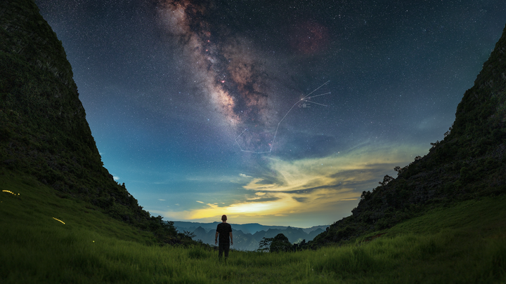 8月的夜晚是最适合欣赏银河的时间,牛郎星、织女星和天津四组成的“夏季大三角”,天黑后就会出现在东方天空。银河最明亮的区域——银心就在天蝎座和人马座之间,这也是银河系中心的方向。