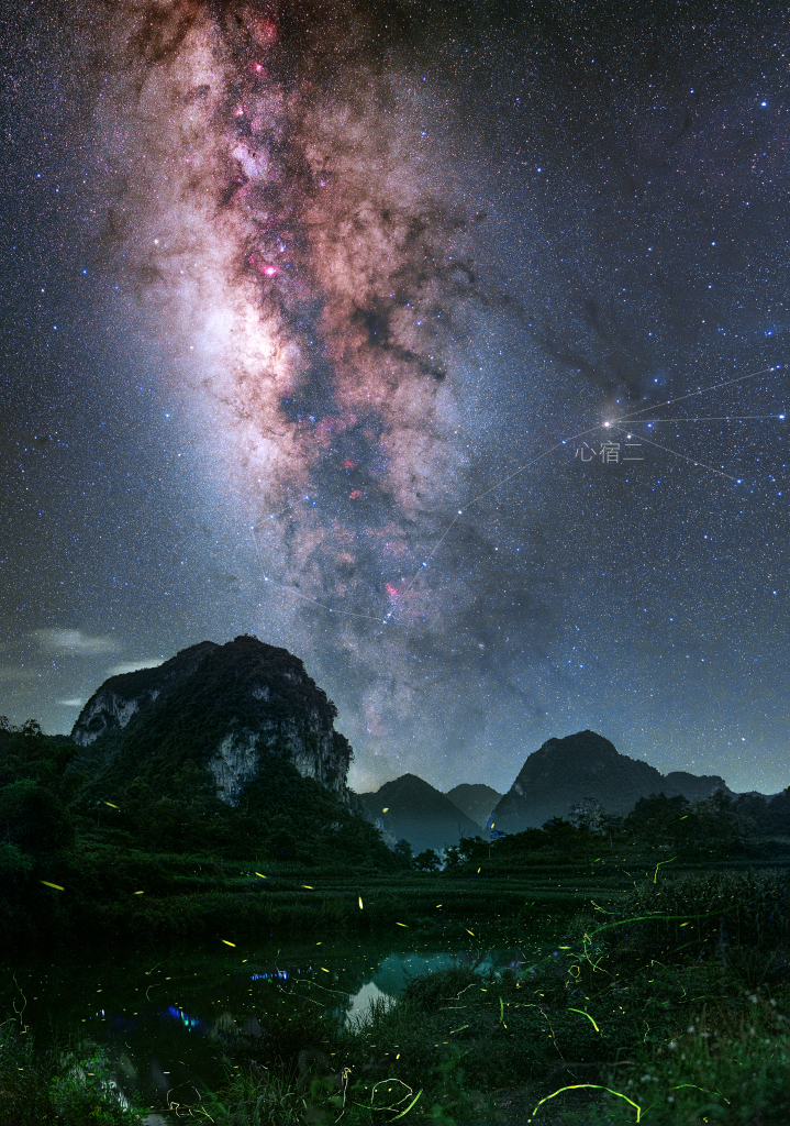 “作为夜空中的‘显眼包’,‘心宿二’就紧紧依偎在银心旁边,散发着幽幽的红光。‘心宿二’周围呈‘S’形排列的亮星构成蝎子形态,尾部钩状延伸至银河亮带中,与银河相映成趣。”王俊峰说。