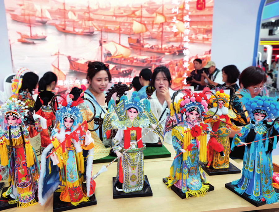观众观看服贸会文旅服务专题展区通州展台上的戏曲人物造型摆件(2024年9月15日摄)。 陈晔华摄/本刊