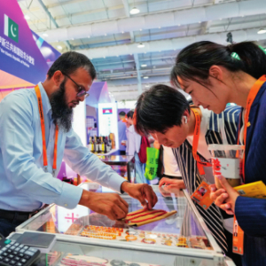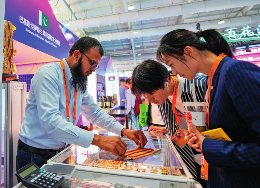 服贸会首钢园区内,参观者在巴基斯坦伊斯兰共和国驻华大使馆展区选购商品(2024年9月12日摄)。 鞠焕宗摄/本刊