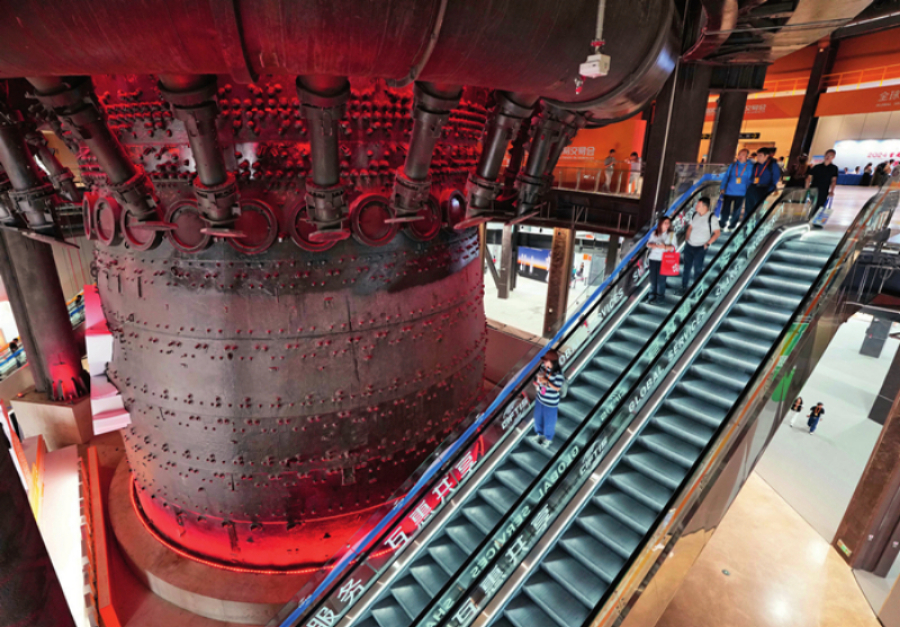 在首钢园四高炉内,服贸会参会人员从会议区离开(2024年9月13日摄)。 陈晔华摄/本刊