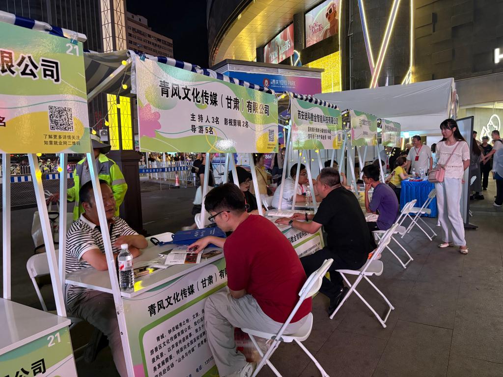 周末夜幕降临,在距离甘肃省兰州市中山桥不远的张掖路步行街,一场“招聘大集”伴着乐队的歌声“开市”。琳琅满目的招聘“小摊”前,求职者和用人单位工作人员分享岗位信息、达成就业协议。