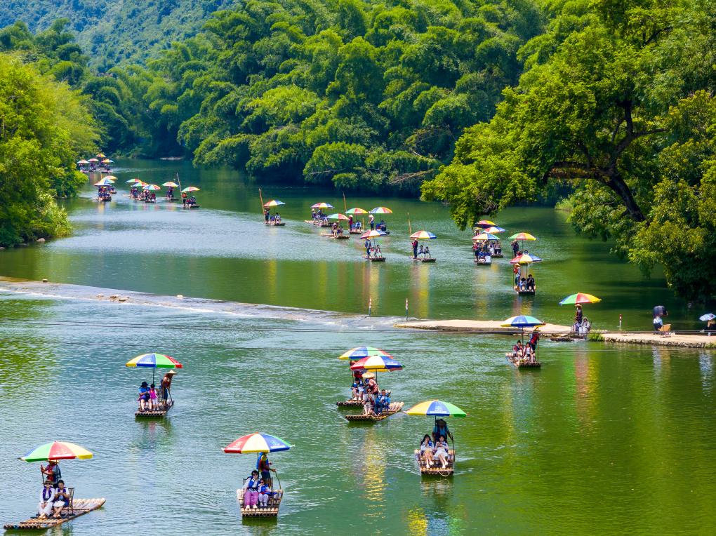7月31日,游客在广西桂林市阳朔县遇龙河乘坐竹筏漂流(无人机照片)。新华社发(何华文摄)