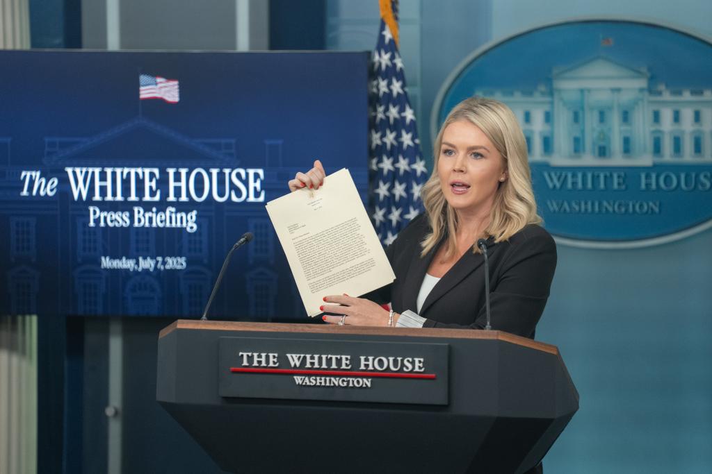 7月7日,在美国首都华盛顿白宫,白宫新闻发言人卡罗琳·莱维特在记者会上展示美国总统特朗普致日本首相的信函。新华社记者胡友松摄