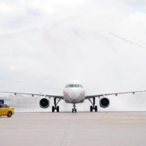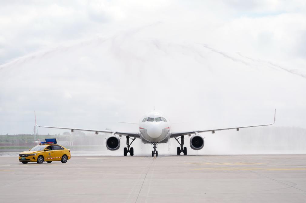 8月11日,大熊猫“芝士”与“芝麻”所乘航班平稳降落在哈尔滨太平国际机场。新华社记者 王松 摄
