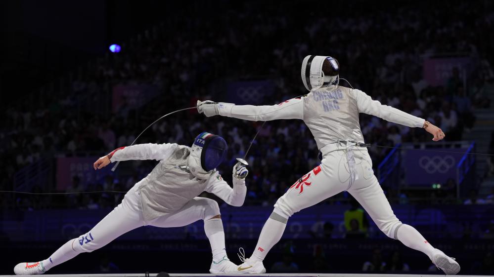 2024年7月29日,中国香港选手张家朗(右)在巴黎奥运会击剑项目男子个人花剑决赛中战胜意大利选手菲利波·马基,夺得冠军。新华社记者 费茂华 摄