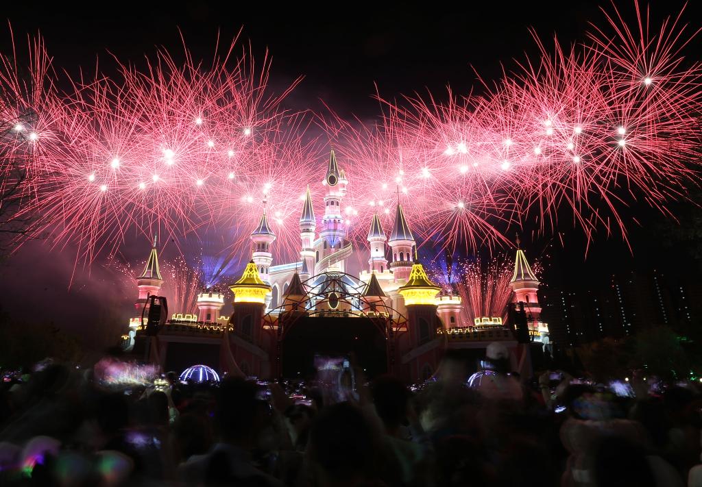 游客在沈阳方特欢乐世界观赏烟花表演。新华社记者 龙雷 摄