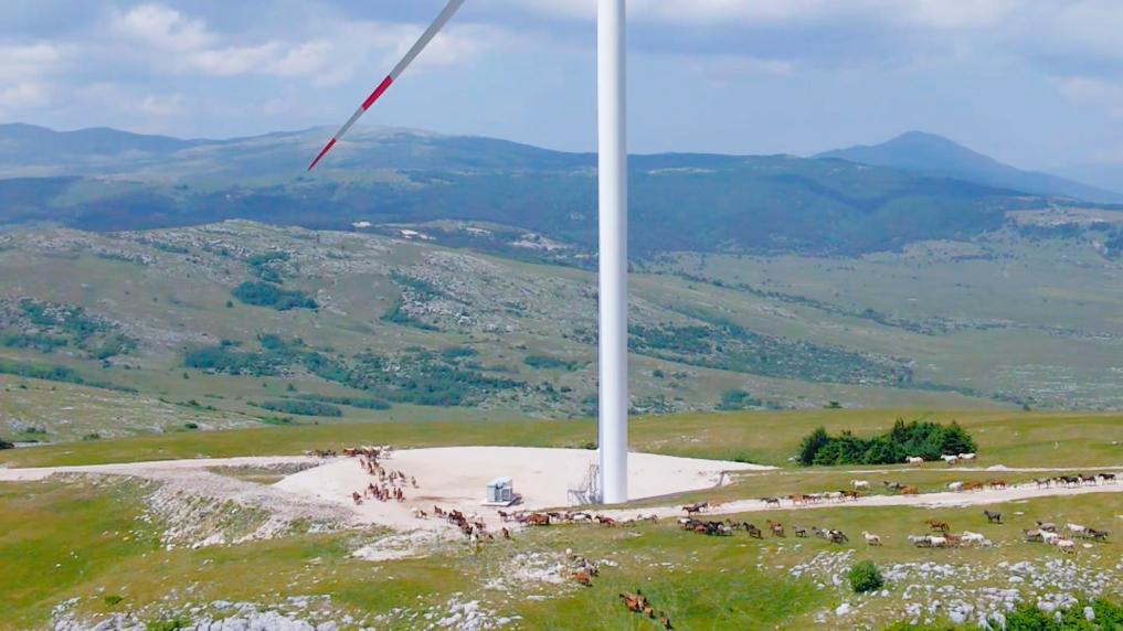 由中企投建的波黑首个新能源发电项目——伊沃维克风电项目已并网近一年,年发电量可达2.59亿千瓦时,每年减少二氧化碳排放约24万吨。为守护当地生态,建设者将风机叶尖涂成红色,避免飞鸟误撞,还定期为风电场内的“原住民”——野马饲盐补水。