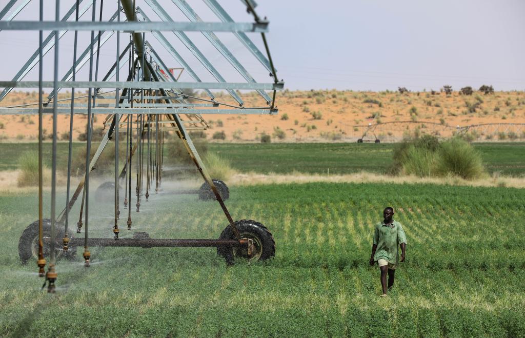 7月18日,在毛里塔尼亚伊迪尼村,牧民在中国援毛里塔尼亚畜牧业技术示范中心的紫花苜蓿田检查喷灌设备的运行情况。新华社记者 韩旭 摄