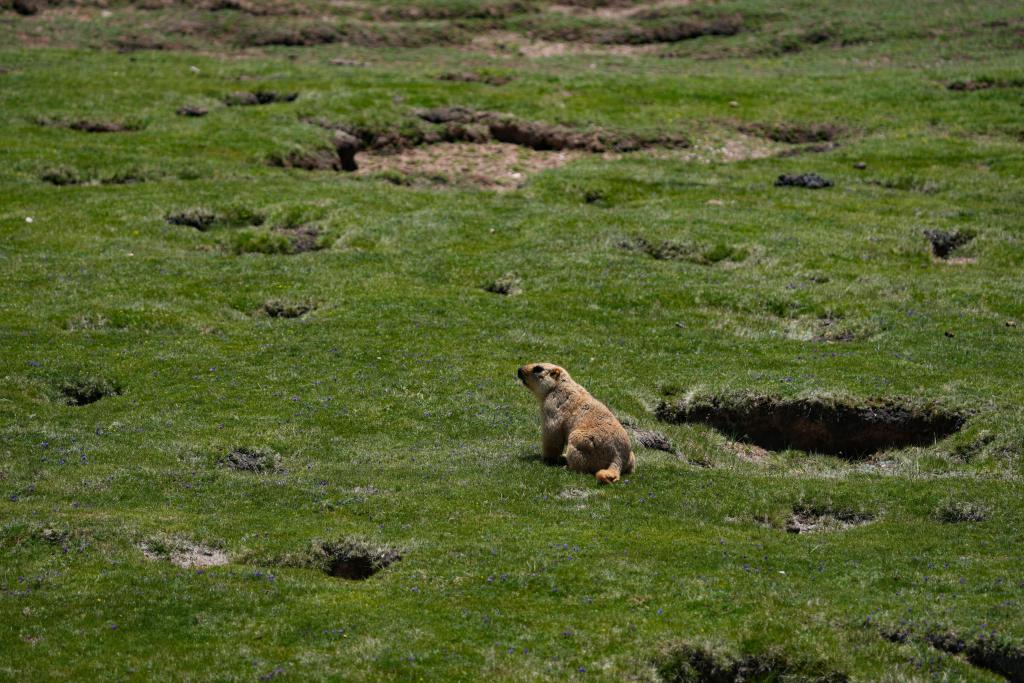顺着地平线看去,一只喜马拉雅旱獭从洞穴中冒出头,嗅嗅周边的气味,确认安全后,探出身子在洞穴周围寻觅充饥的干草——只是它不知道,如果搬运不及时,一些储存在洞口的干草,将被迁徙而至的藏羚羊顺口吃完。