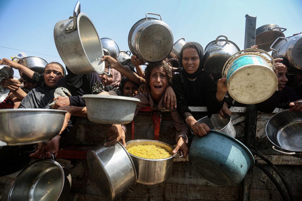 8月10日,在加沙城,民众领取免费食物。新华社发(里泽克·阿卜杜勒贾瓦德摄)