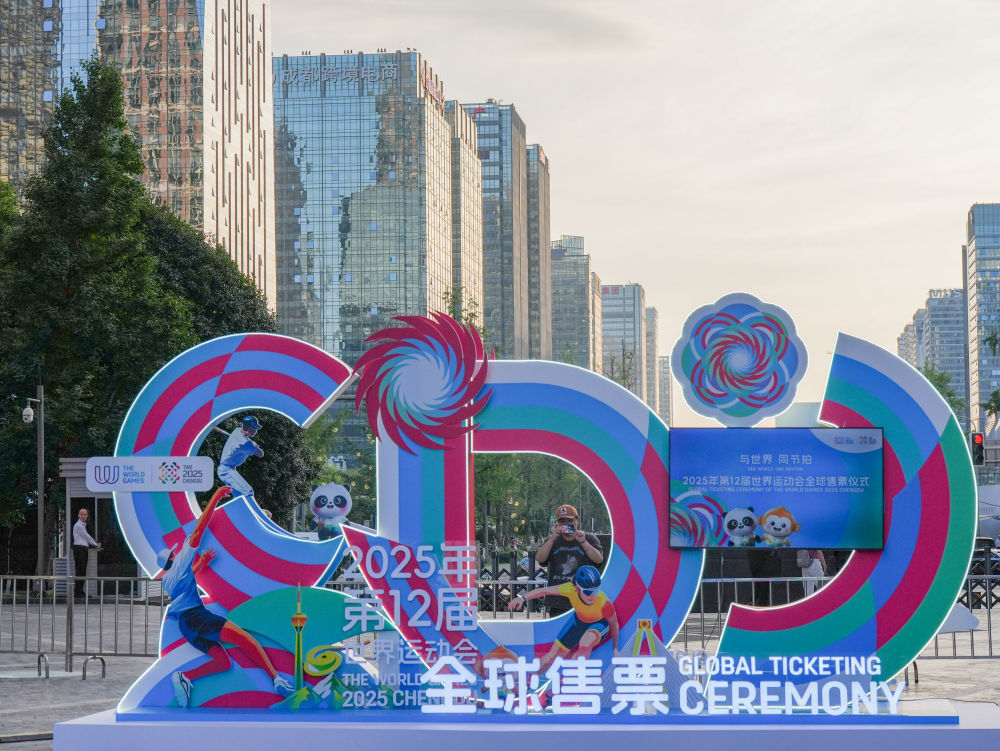 ↑6月30日,游客在成都世运会全球售票主题装置前拍照。新华社记者王曦摄