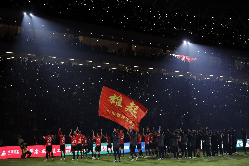 ↑2024年3月2日,成都蓉城队球员在中超比赛后与现场球迷互动。新华社记者沈伯韩摄