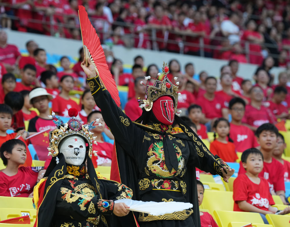 ↑8月12日,在亚冠附加赛现场,身着当地特色服饰的球迷为球队加油助威。新华社记者 王曦 摄