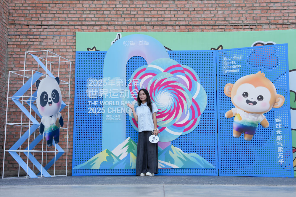 ↑8月7日,在成都东郊记忆·成都国际时尚产业园,游客在世运会主题展板前留影。新华社记者李旭伦摄
