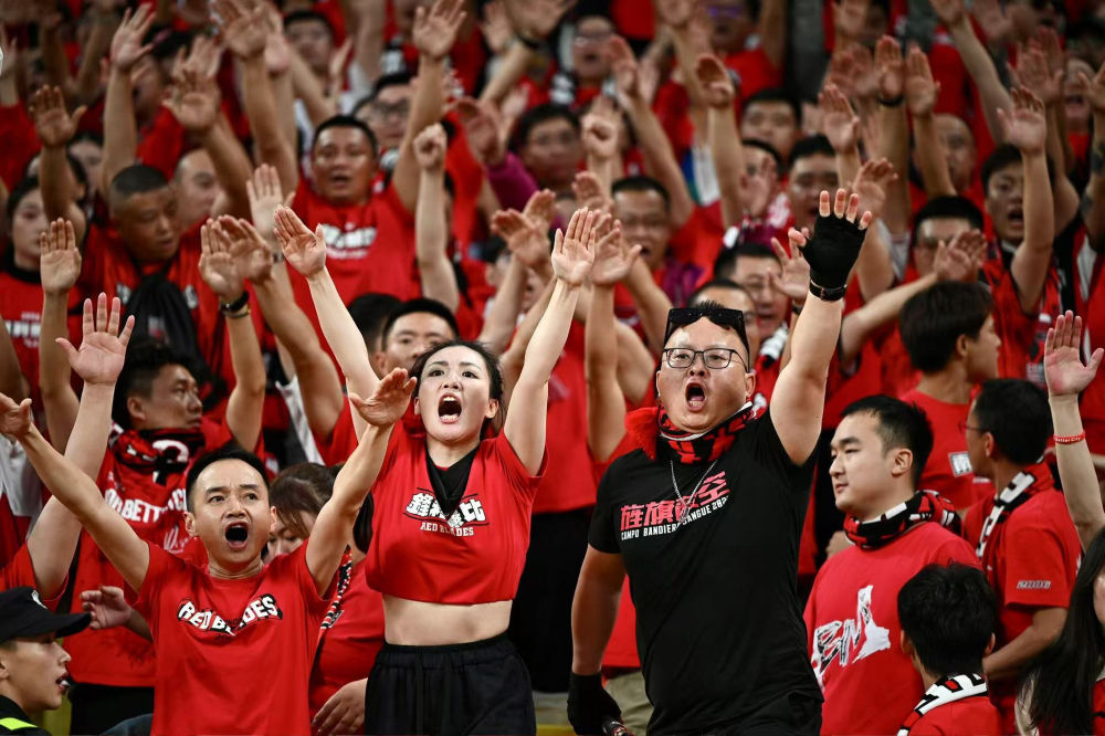 ↑8月12日,在亚冠附加赛现场,成都蓉城队球迷为球队加油助威。新华社记者王曦摄