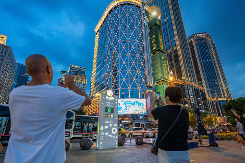 ↑8月7日,人们在成都天府广场上的世运会倒计时牌前拍照。新华社记者谢剑飞摄