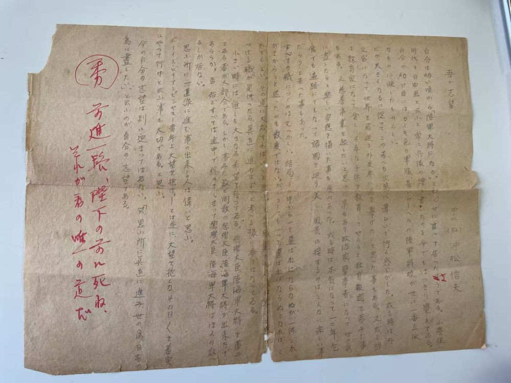 作文写于1940年,当时冲松信夫15岁,在老家广岛上中学。作文用铅笔书写,纸张已经发黄发黑,题目是《我的志向》,总共300多字。他在文中称自己曾梦想从事医生、外交官、陆军大将等很多职业,因为这些梦想非常难以实现,他最后写道:“每天脚踏实地做好小事,积跬步也很重要。我现在还没确定具体的志向,我的志向就是——为了世界,为了日本,尽我所能。”老师给这篇作文打了“优”,但同时对文中透露出的不坚定非常不满,于是继续用红笔写下那句令人触目惊心的批语。
