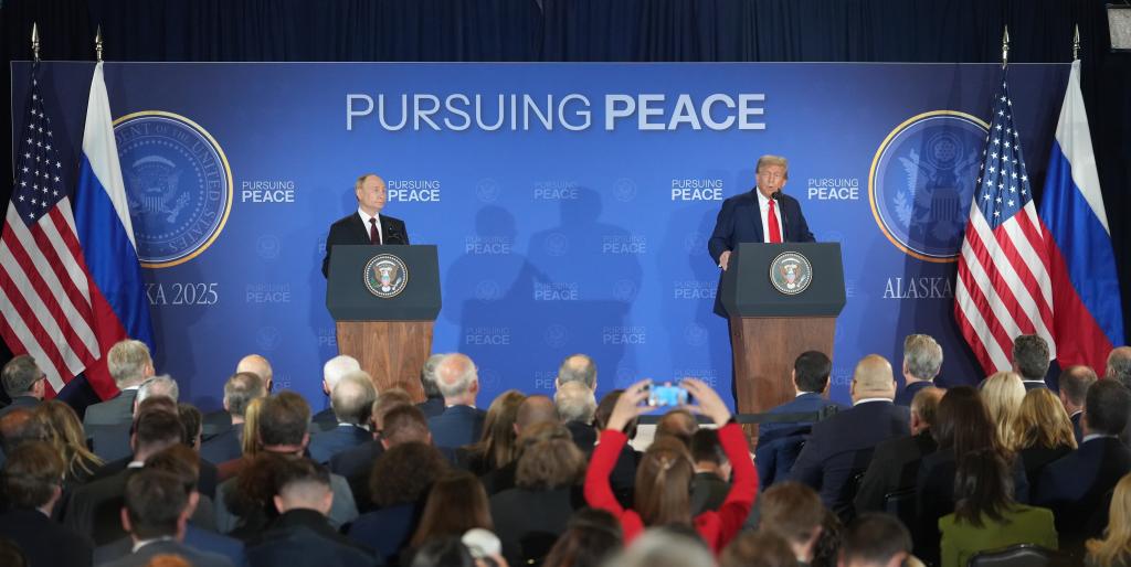 8月15日,美国总统特朗普(右)与俄罗斯总统普京在美国阿拉斯加州安克雷奇市埃尔门多夫-理查森联合军事基地举行会晤后共同出席联合记者会。新华社记者吴晓凌摄