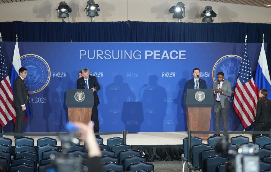 8月15日,在美国阿拉斯加州安克雷奇市埃尔门多夫-理查森联合军事基地,工作人员在新闻发布会会场调试设备。新华社记者吴晓凌摄
