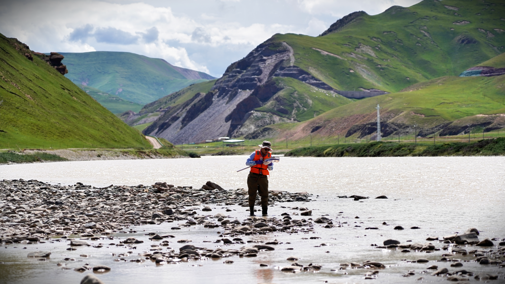 在海拔4800多米的长江南源当曲,李伟穿着红色的防水服,戴着一顶渔夫帽,进入水深一米冰冷刺骨的河中,找寻着鱼类,天边云朵低垂,这位“高原渔夫”,在河边来回穿梭,探寻着江源鱼类生存的奥秘。