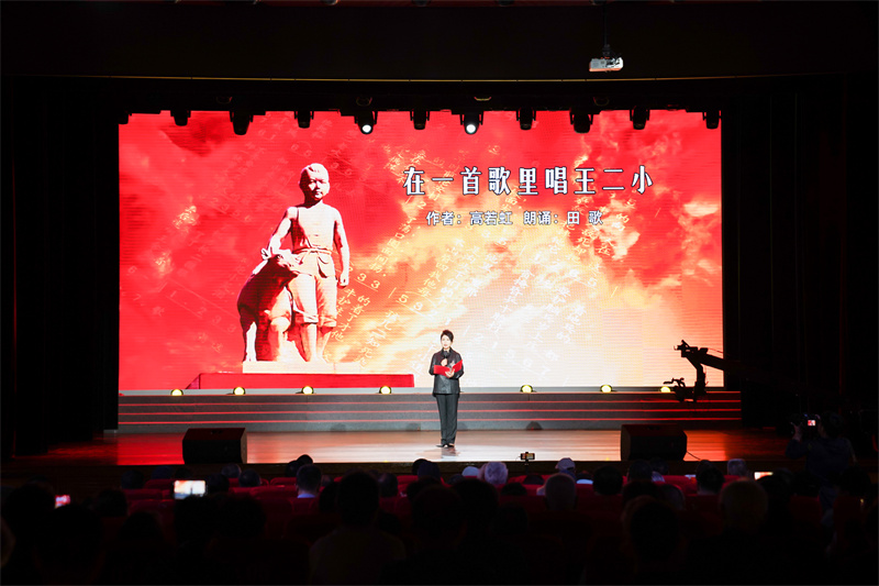 朗诵作品具有多元视角与情感浓度。诗歌切入角度丰富多元。侯明辉的《这把大刀》以器物承载历史与精神,马克的《一封最后的家书》聚焦个体在生死关头的柔情与决绝,雷从俊的《我们的抗战》从十四年宏观的角度回顾了这场战争的奇伟。东来的《二月里最后的棉絮》则以细微意象折射战争的残酷与人性的温暖。崔吉俊的《回太行》、高昌的《致敬公木》、陈灿的《她们要燃烧自己给中国取暖》、郭晓晔的《浊漳河》、宗德宏的《这一天,我们的旗帜飞扬》、刘笑伟的《延安,延安》等,或缅怀先贤,或咏叹山河,或抒发豪情,共同编织了一幅情感浓烈、层次丰富的军旅画卷。张国领的《血太阳》以其强烈的意象和冲击力,奠定了基调的悲壮与崇高。高昌的《致敬公木——爷爷和孙女的对话》,则从独特的视角,致敬《中国人民解放军军歌》的词作者公木先生。而作者高昌的爱人就是公木的亲孙女,因此作品的情感色彩非常浓厚,直抒胸臆。两代人隔空对话,讴歌的是同一个主题:我们的队伍向太阳!