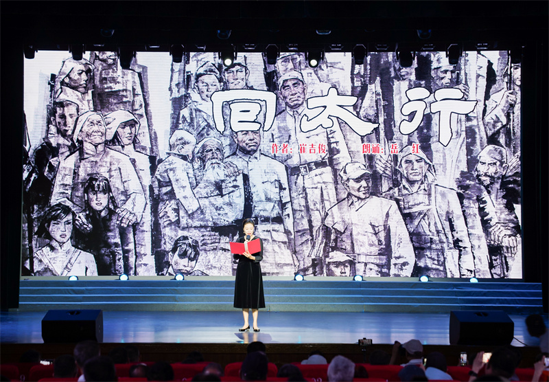 “诗行记录历史,信仰照彻长空。他们生逢乱世,化笔为枪,将黄河的怒吼融入诗行,在历史的辽阔之地持久涌动着向前的波涛,写下中华民族的命运交响;他们扎根祖国大地,以笔锋划过泣血的河山,为人民军队阔步行进、横扫敌寇、气吞万里鼓与呼,向前,向前,向前,穿越过往,直抵未来,唤醒不可战胜的力量……”朗诵会以《向军旅诗坛远去的身影致敬》节目拉开序幕,随着央视著名主持人汪文华满含深情地宣读致敬词,大屏幕上不断闪现光未然、公木、魏巍、郭小川四位已故著名军旅诗人的身影,全场沉静,怀念之情油然而生,大家以遥远的忆念和不停流淌的泪水,向已然成为远去身影的军旅诗人致敬。