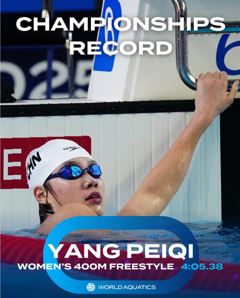 新华社布加勒斯特8月22日电(记者周欣)在接连赢得4X200米自由泳接力和女子800米自由泳冠军后,杨佩琪22日继续在世界泳联世界青年游泳锦标赛上的神奇之旅——以4分05秒38打破赛会纪录,摘取400米自由泳桂冠,她15岁的队友严窕珊获得亚军。