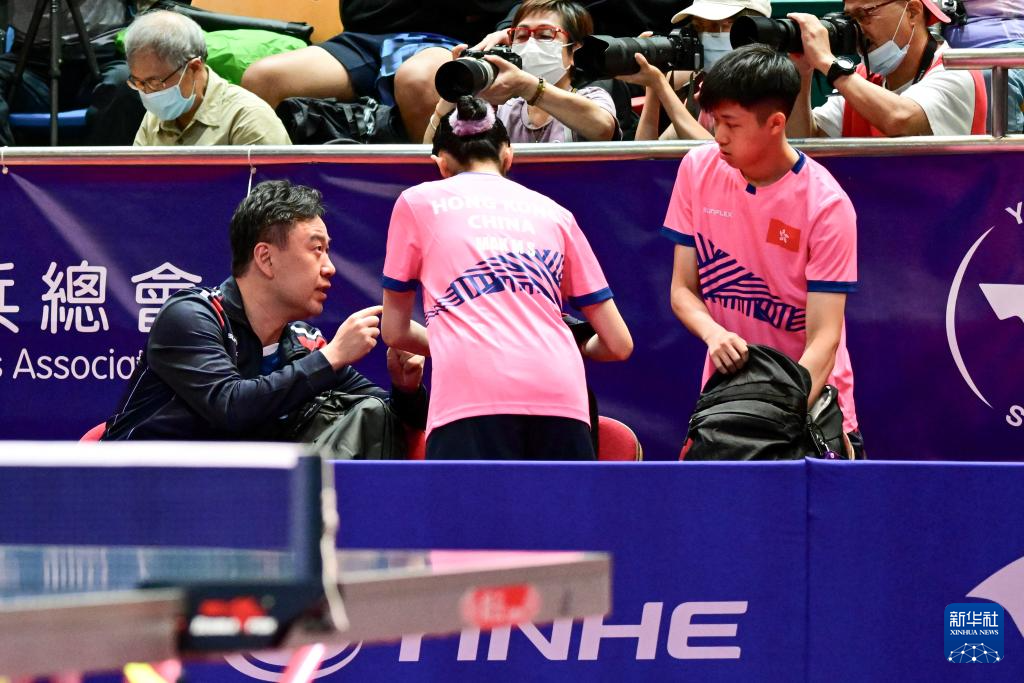 7月31日,孟宪俭(左)在香港举行的一场青少年乒乓球比赛中指导球员。新华社记者 朱炜 摄