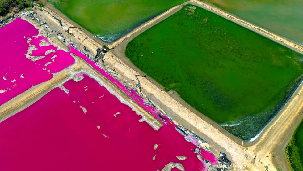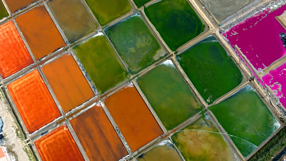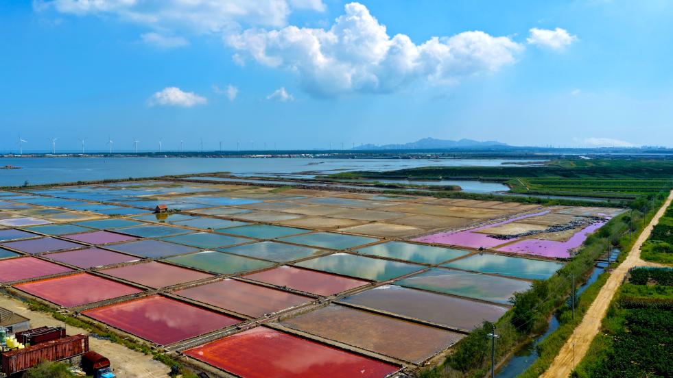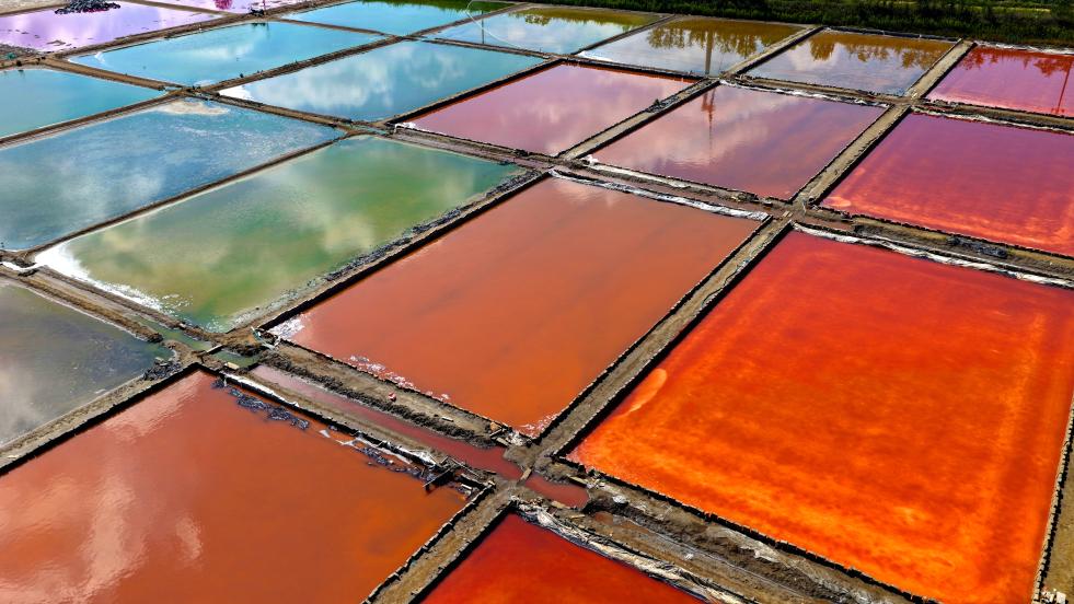 初秋时节,山东省荣成市一处盐田在阳光下呈现出五颜六色的景象,宛如大自然的“调色盘”,美不胜收。