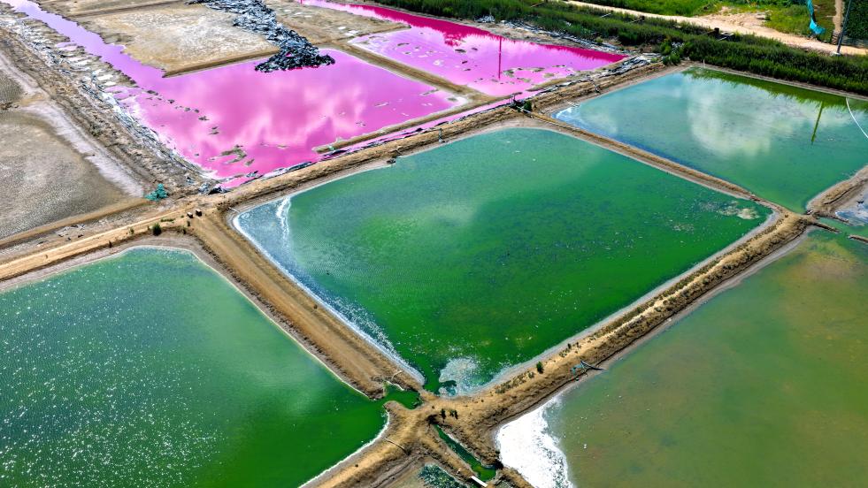 以上图片:2025年8月24日在山东省荣成市一处盐田拍摄的景致。(无人机照片)CICPHOTO/杨志礼 摄
