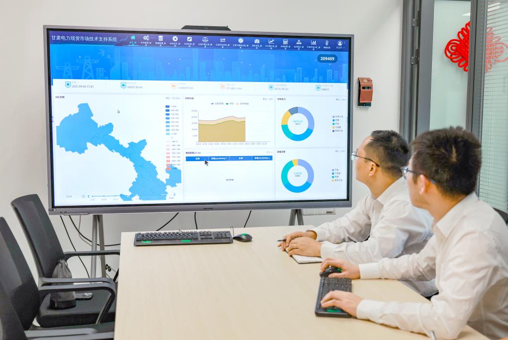 国网甘肃省电力公司相关工作人员正在实时监测电力现货交易情况。(韩甜甜 摄)