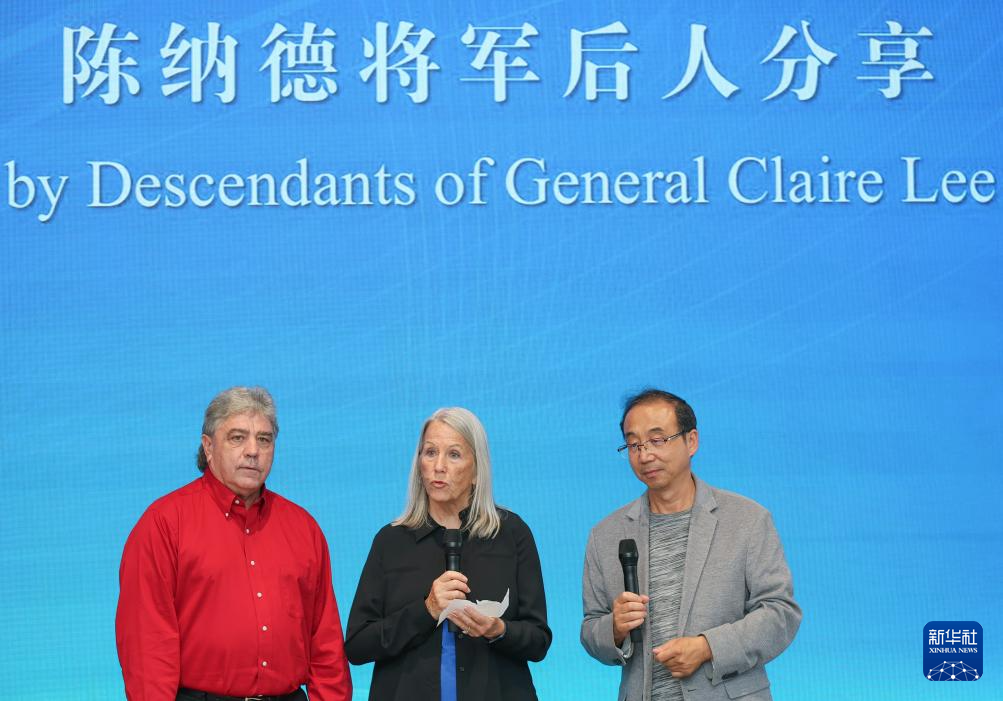 8月30日,在重庆国际会客厅,飞虎队陈纳德将军的孙女帕蒂·卢·陈纳德·史密斯(中)在仪式上致辞。新华社记者 陈诚 摄