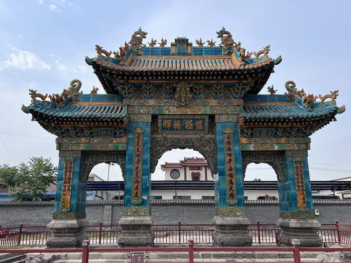 太和岩牌楼藏在北辛武村深处的一处院落。牌楼始建于清光绪二十三年(1897年),通体以孔雀蓝为主调的琉璃覆盖,四柱三楼的歇山顶如展翅欲飞的彩蝶,彩色相间的琉璃瓦拼出灵动的“回”字形,檐角垂落的琉璃瑞兽似要腾云而去,柱上的匾额与浮雕相映。采用仿木雕、透雕等技法,融合了道教符号与吉祥寓意。