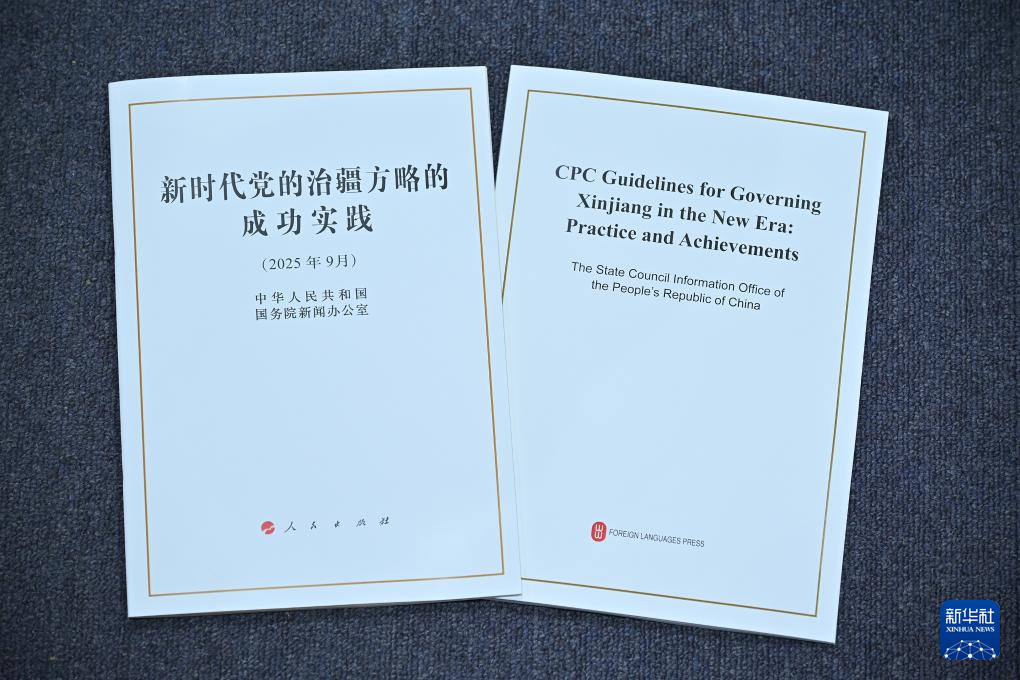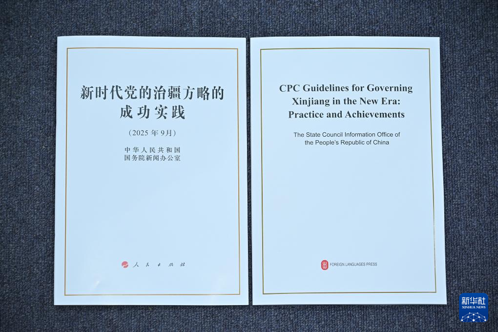 9月19日,国务院新闻办公室在北京举行新闻发布会,发布《新时代党的治疆方略的成功实践》白皮书,中央宣传部副部长王纲,新疆维吾尔自治区党委副书记、自治区主席艾尔肯·吐尼亚孜,新疆维吾尔自治区党委常委、自治区常务副主席陈伟俊,新疆维吾尔自治区党委常委、宣传部部长王建新出席,介绍白皮书有关情况并答记者问。这是《新时代党的治疆方略的成功实践》白皮书。新华社记者 李鑫 摄