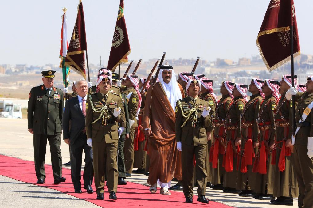 9月17日,在位于约旦首都安曼的马尔卡机场,约旦国王阿卜杜拉二世为到访的卡塔尔埃米尔(国家元首)塔米姆举行欢迎仪式。新华社发(穆罕默德·阿布·古什摄)