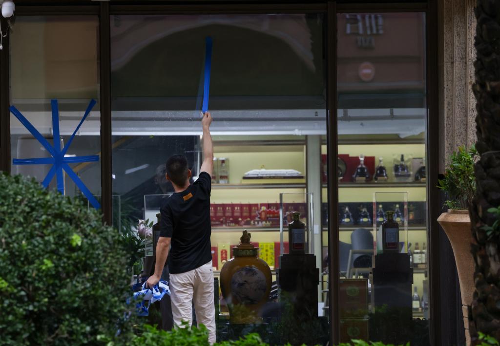 9月24日,随着今年第18号台风“桦加沙”强度逐渐减弱并远离深圳,在深圳南山区一家刚开门的临街店铺,一名工作人员拆掉玻璃上的胶带。新华社记者 毛思倩 摄