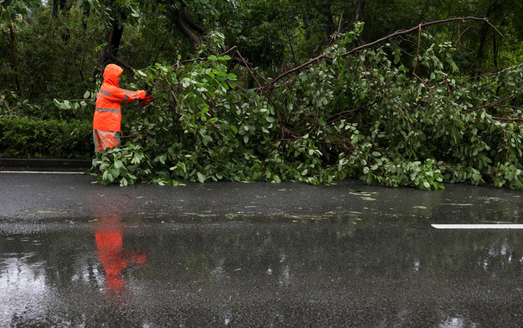 9月24日,随着今年第18号台风“桦加沙”强度逐渐减弱并远离深圳,环卫工人在深南大道清理倒伏的树木。新华社记者 毛思倩 摄